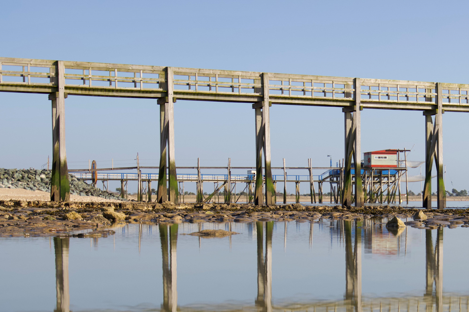 Typiques du littoral charentais, les carrelets sont des engins de pêche. Leur ponton s'avance au-dessus de l'estran et, dans leur grand filet carré, les pêcheurs remontent à la marée toutes sortes d'espèces : anguilles, bars, soles, crevettes... selon la chance et la saison. Dans l'abri prévu à cet effet, une table et des bancs accueillent les pêcheurs et leurs piques-niques.