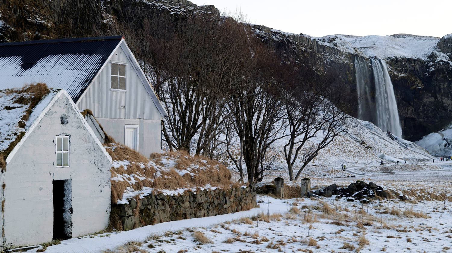 Ferme à côté des cascades de Seljalandsfoss, Islande. Cette cascade d’une hauteur de 62m est sur le parcours de la rivière Seljalands, issue des fontes du célèbre glacier Eyjafjallajökull. D’autres petites cascades agrémentent la falaise fossile de l’ancien rivage.