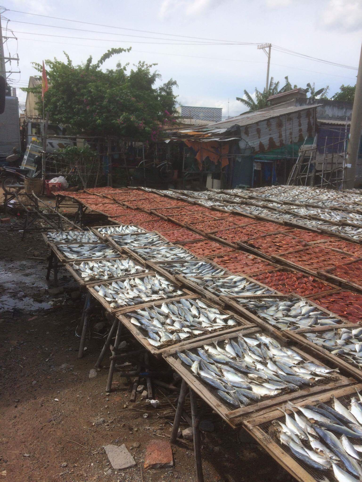 Pêche du jour sur des étalages proches de la plage. Souvent, les femmes des pêcheurs font cuir le poisson directement sur un réchaud posé sur le sol.