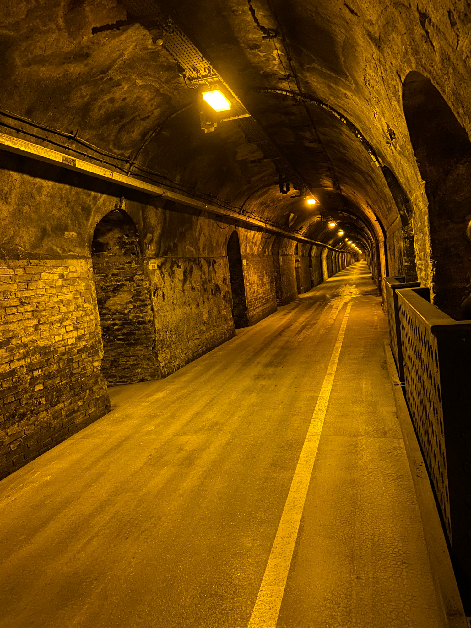 L’avenue centrale de la Maison Mumm, baptisée Champs Elysées, mesure plus de 400 mètres de long et permet au personnel de l’entreprise de circuler sous terre entre les foudres gigantesques et les bouteilles qui vieillissent sur leurs pupitres.