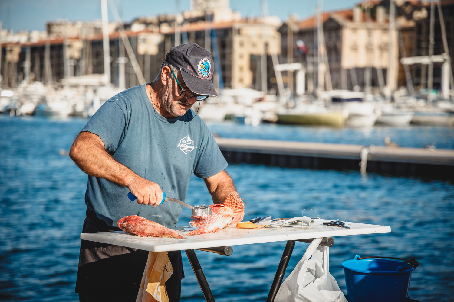 The fish market in the Old Port of Marseille is probably as old as the city itself. From 1909 to 1976, it was installed in the fish markets of La Criée on the Quai de Rive Neuve, since transformed into a national theater on the pediment of which the inscription Criée libre aux poissons still appears. Today the fish market is held every morning on the Quai de la Fraternité, at the end of the Old Port, near the boats of the fishermen who unload and sell their catch directly after returning from fishing.