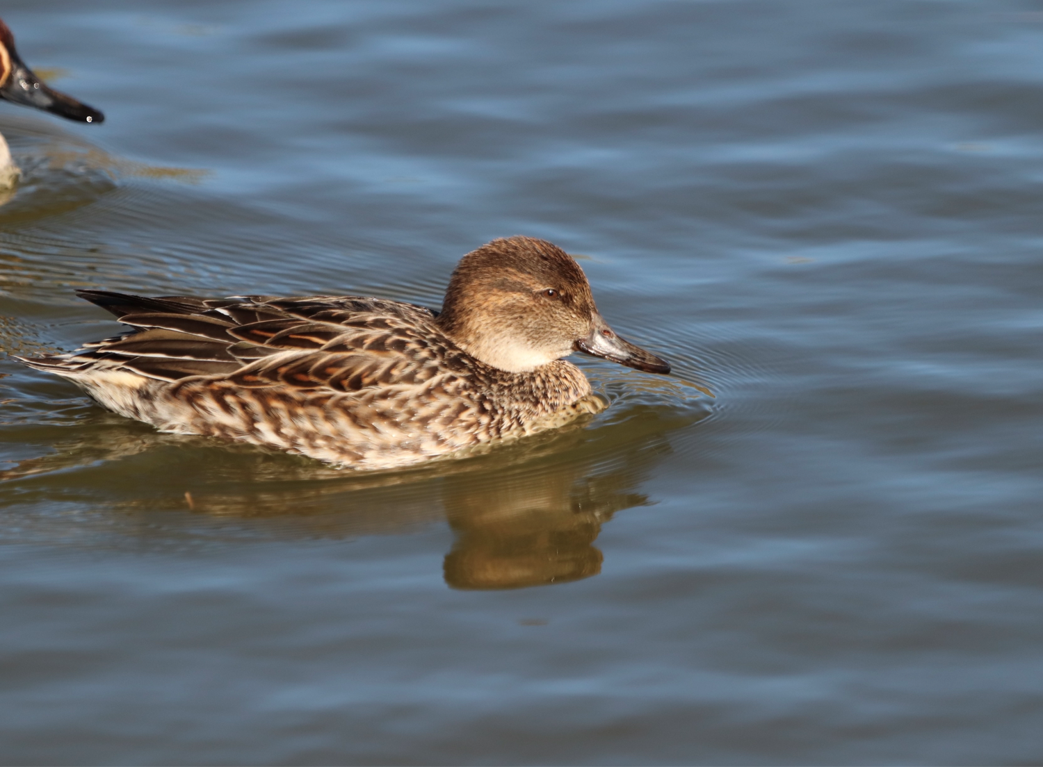El plumaje de las hembras es principalmente de tonos pardos, con un fondo claro con veteado más oscuro. Su píleo marrón oscuro y sobre los ojos aparece una franja superciliar clara y una postocular oscura, y los carrillos y el cuello son más pálidos y están finamente rayados de pardo.