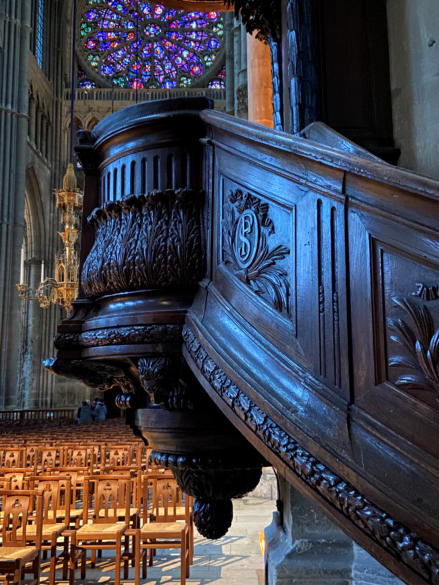 Sculpture en bois réalisée en 1770 par le sculpteur rémois Blondel, elle porte le symbole SP pour Saint Pierre le Viel.