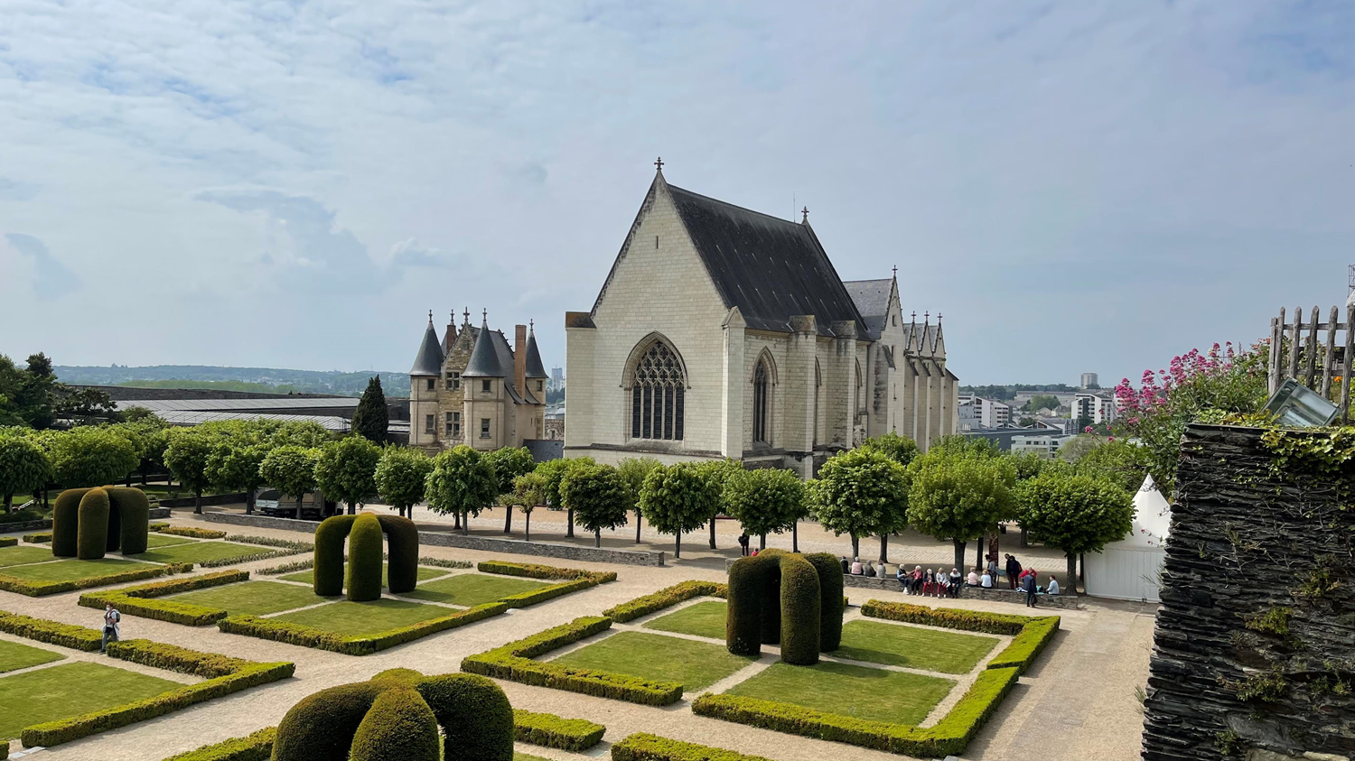 Château d’Angers ( Maine Et Loire ). Les vestiges de la chapelle ont été découverts en 1953, à l'occasion des travaux de terrassement de la galerie de l'Apocalypse. L'actuelle chapelle Sainte-Geneviève-Saint-Laud est une chapelle du xiie siècle construite en surplomb de la Maine mais à l'extérieur de l'enceinte du xiiie. Elle mesure cinq mètres sur quinze et était couverte d'une voûte de pierre en berceau et en plein cintre. Il subsiste encore sur le mur nord des colonnes avec des chapiteaux sculptés[53]. Elle est désormais visible en surplomb à l'extrémité de la galerie de l'Apocalypse.