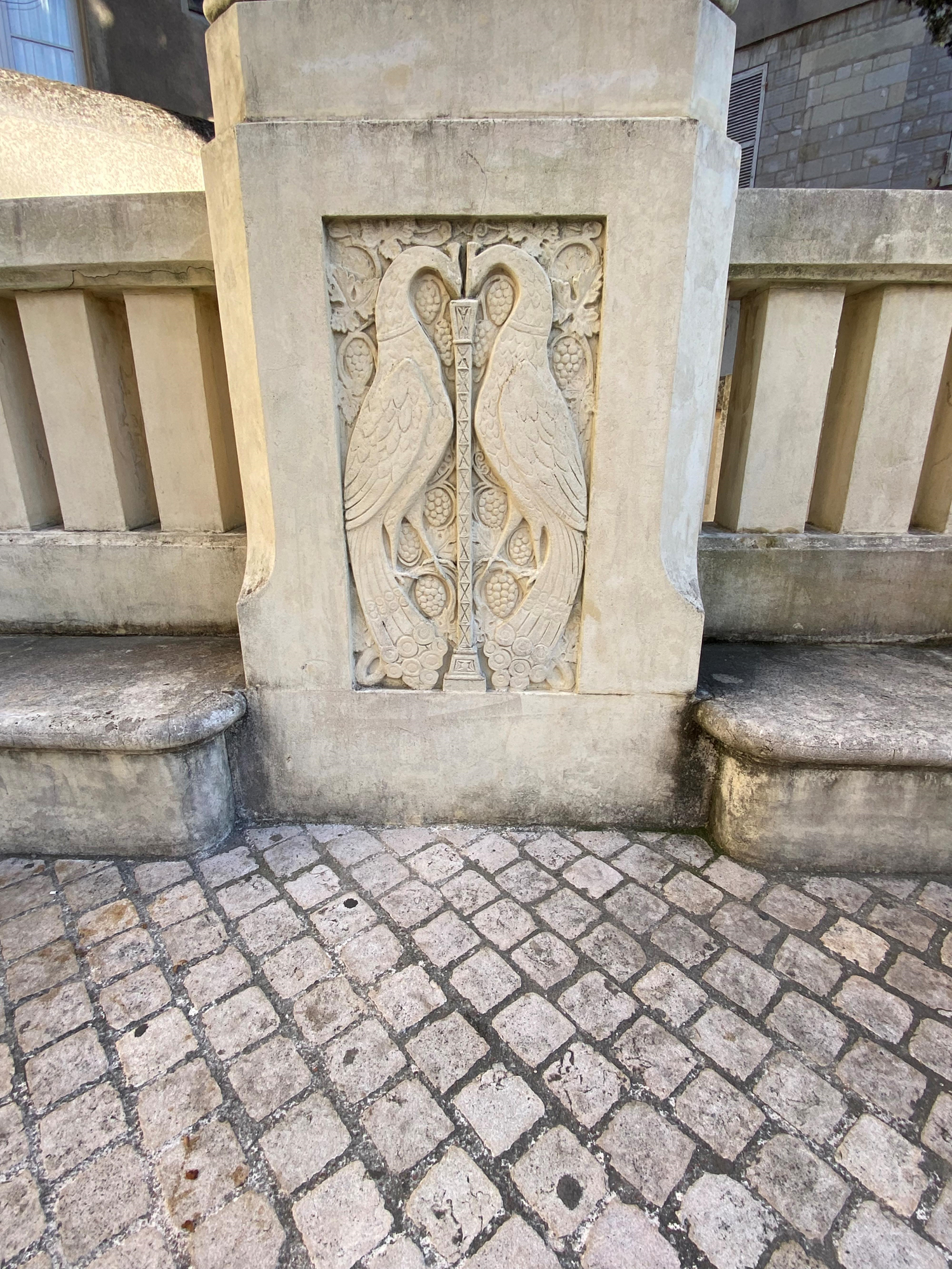 Détail des sculptures du piédestal où l’on peut voir 2 paons s’affrontant de part et d’autre d’un vase.