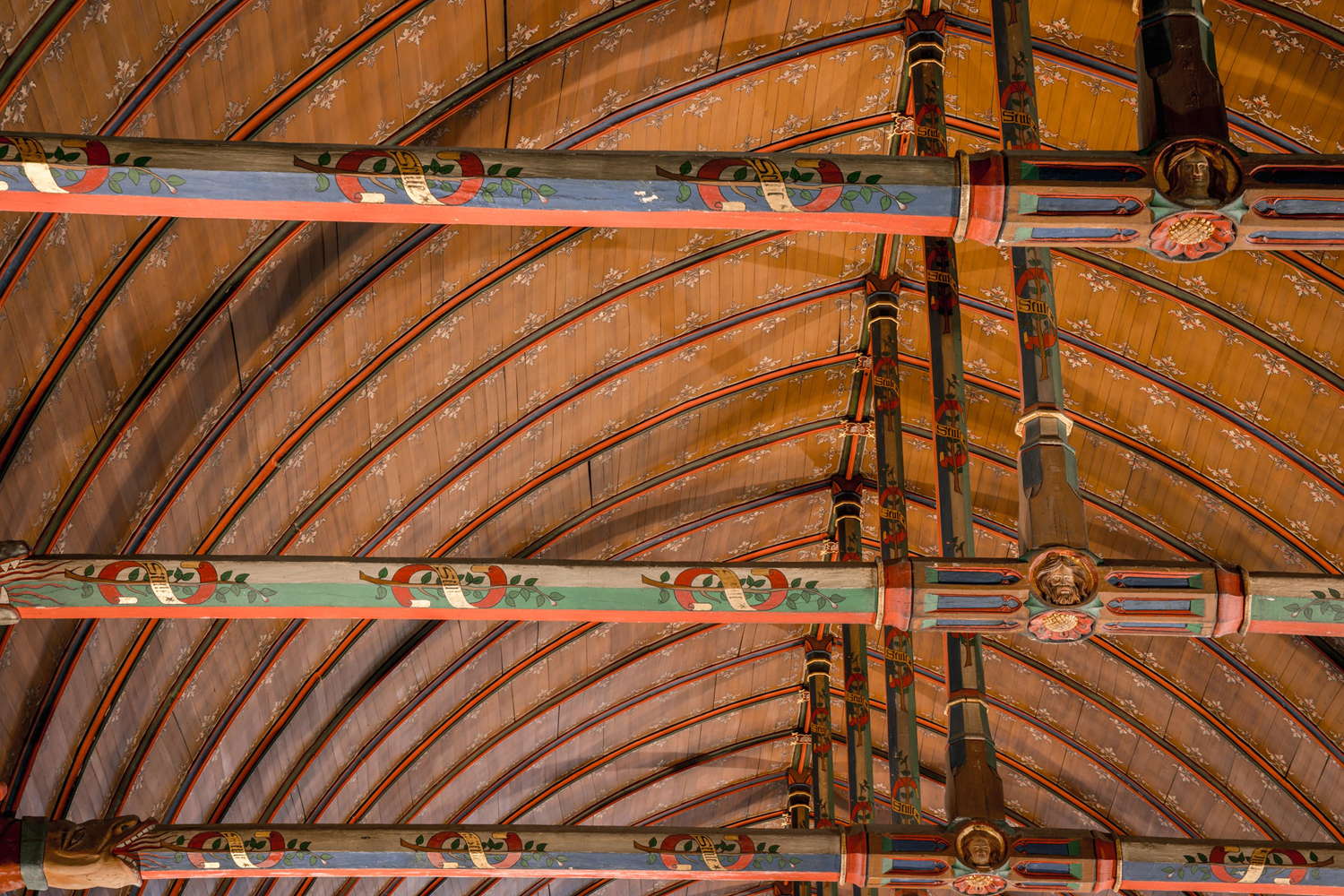 The Grande Salle des Pôvres (Great Hall of the Poor) in the Hospices de Beaune is surmounted by a monumental structure with an inverted hull, itself covered with Trélazé slates. This exposed frame in oak paneling is crossed by polychrome beams coming out of gobblers, mouths of multicolored dragons evoking the monsters of hell. The spans are punctuated by small caricatures sculpted in the effigy of Beaunois bourgeois. Animal heads illustrating their respective faults accompany their faces.