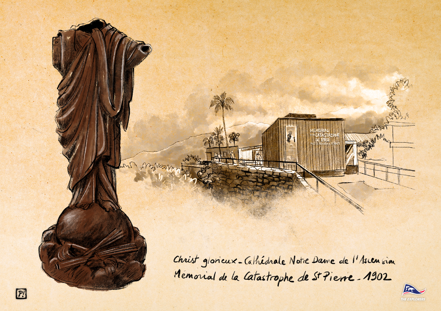 Au mémorial de la catastrophe de la Montagne pelée de 1902, les restes de la statue du Christ glorieux de la cathédrale de Saint-Pierre détruite par l'éruption.