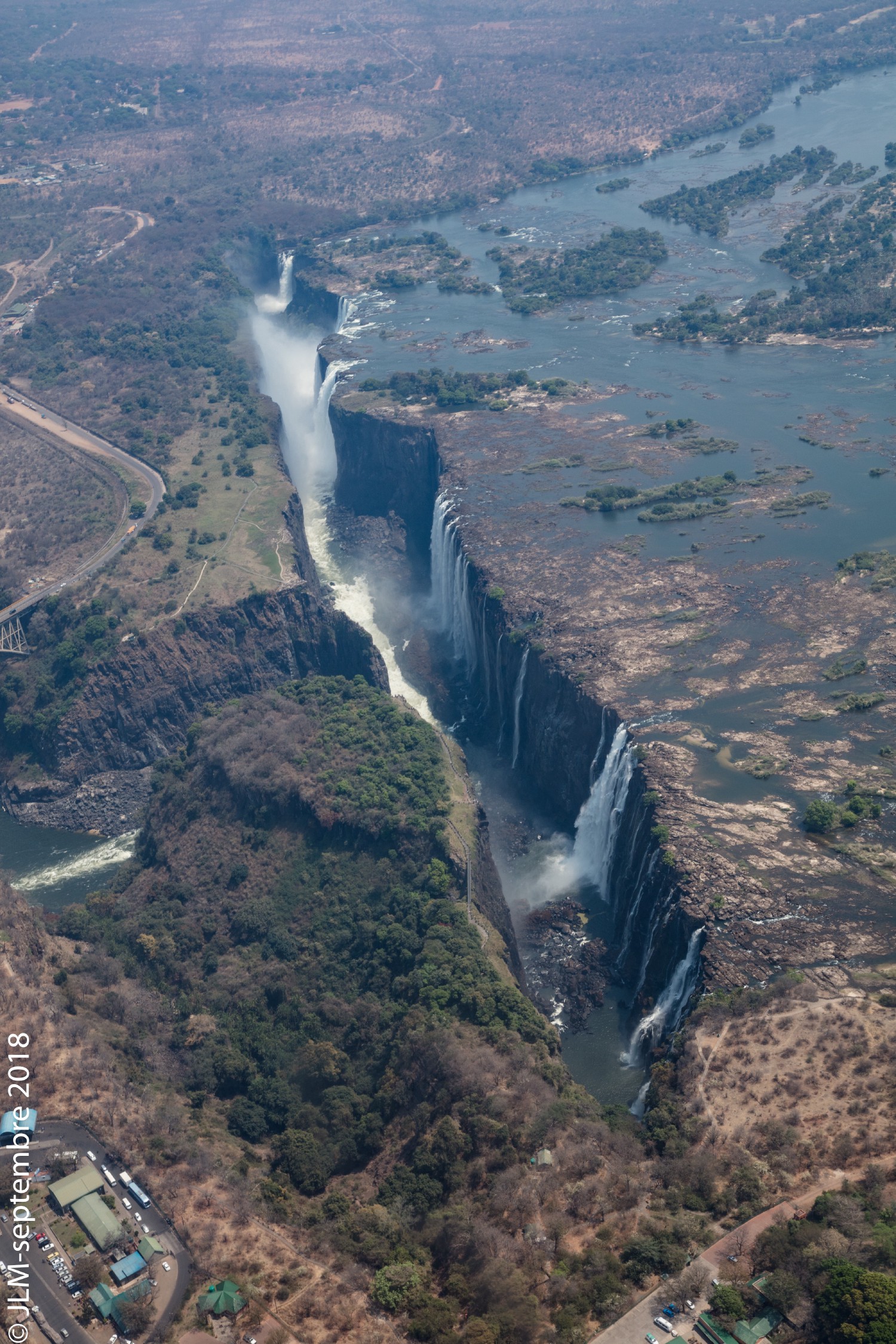 A Livingstone, le zambéze tombe dans une faille géologique, les Victoria Falls qui séparent 3 pays, la Zambie, le Zimbabwe et le Botswana, Les sécheresses à répétition ont ralenti le débit d'eau au point qu'aujourd'hui les splendides chutes Victoria peuvent disparaitre par manque d'eau.