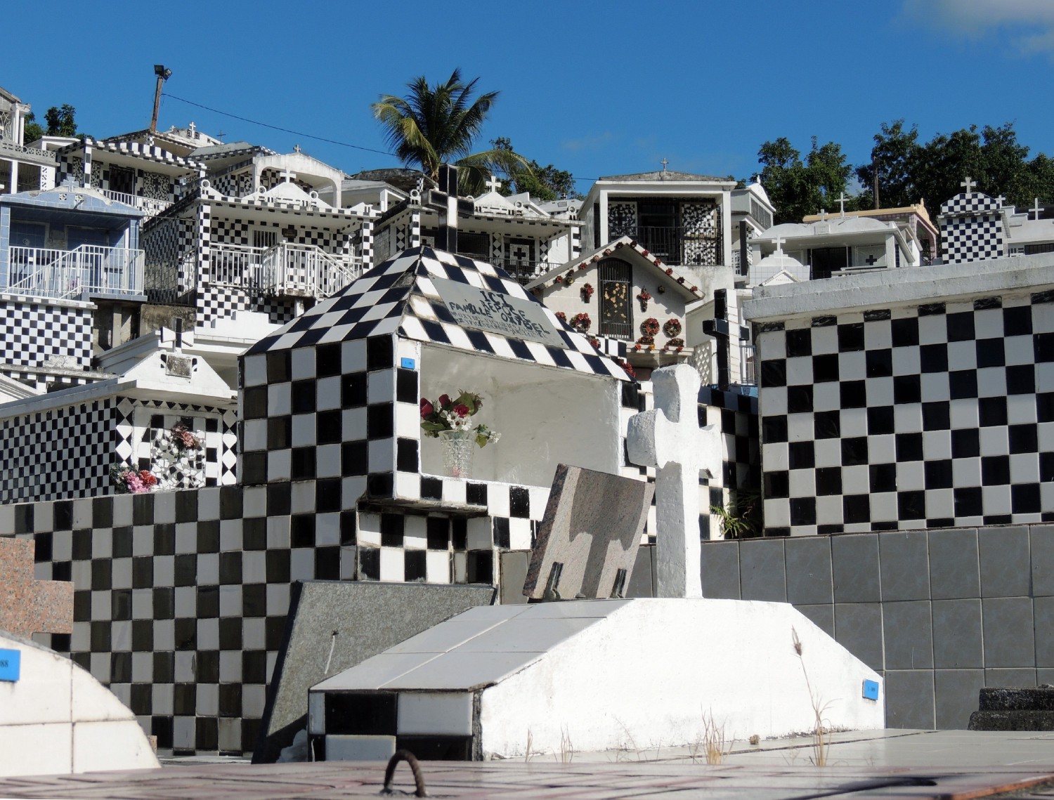 Morne à l'eau, en Guadeloupe est célèbre pour son immense cimetière dont les tombes sont décorées de carreaux noirs et blancs, tels des damiers.