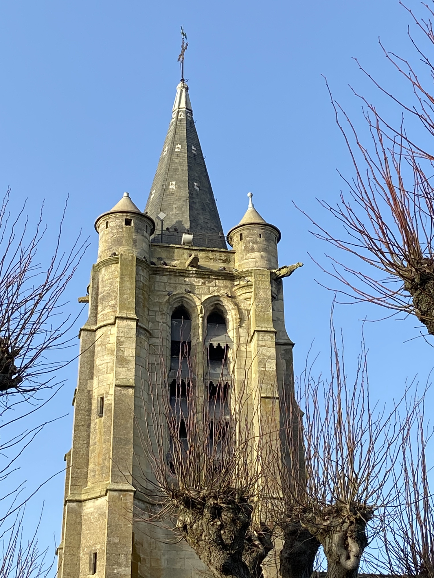 Le clocher, austère et d’aspect militaire, étonne par la quasi-absence d’ornementations. On trouve des échauguettes aux extrémités supérieures, coiffées par des toits en poivrière. La flèche octogonale est en charpente et couverte d’ardoise, ce qui est peu courant dans le style gothique flamboyant où les flèches étaient plus couramment en pierre.