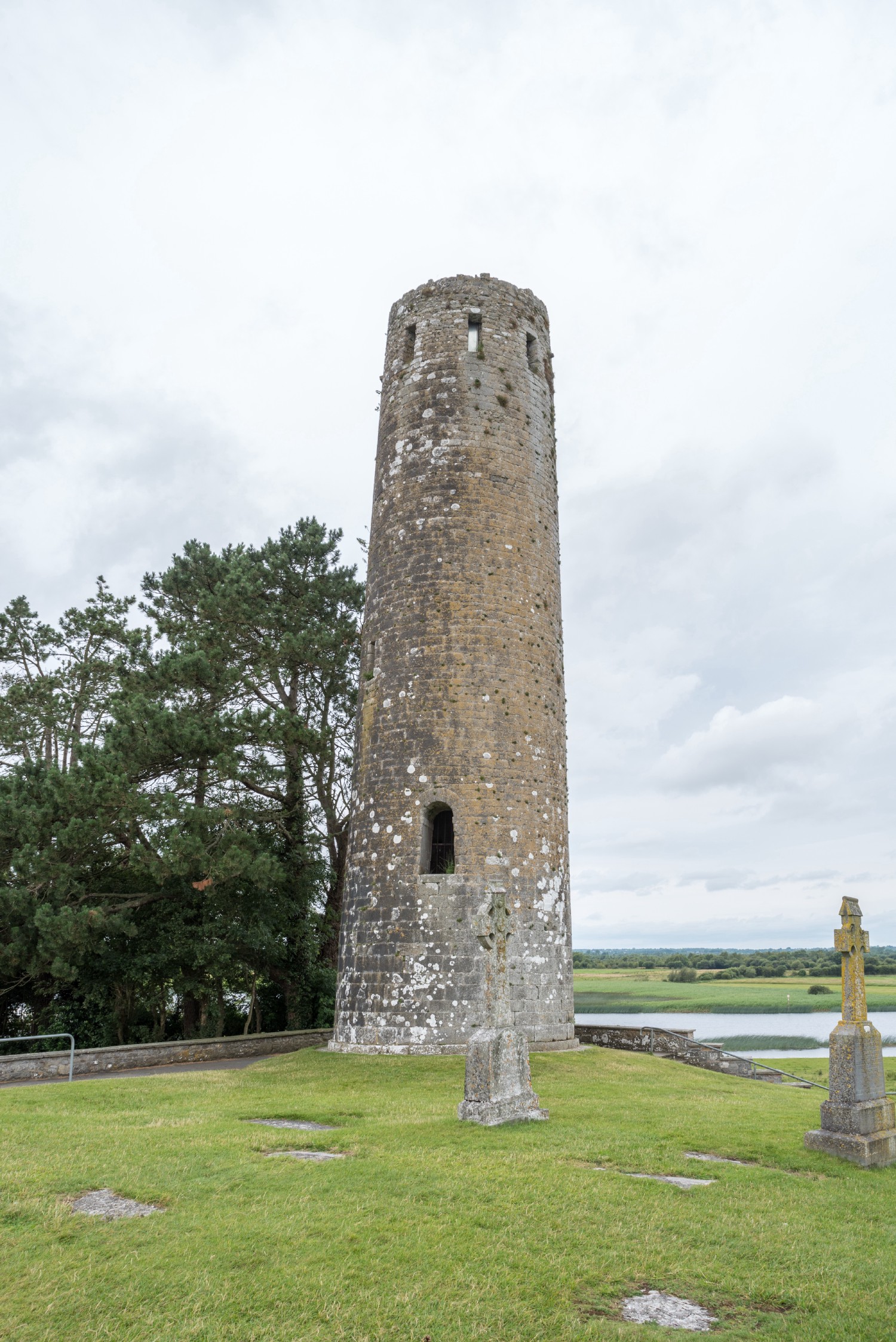 Monastère de Clonmacnoise. Tour servant de refuge et à l'arrière le fleuve Shannon.