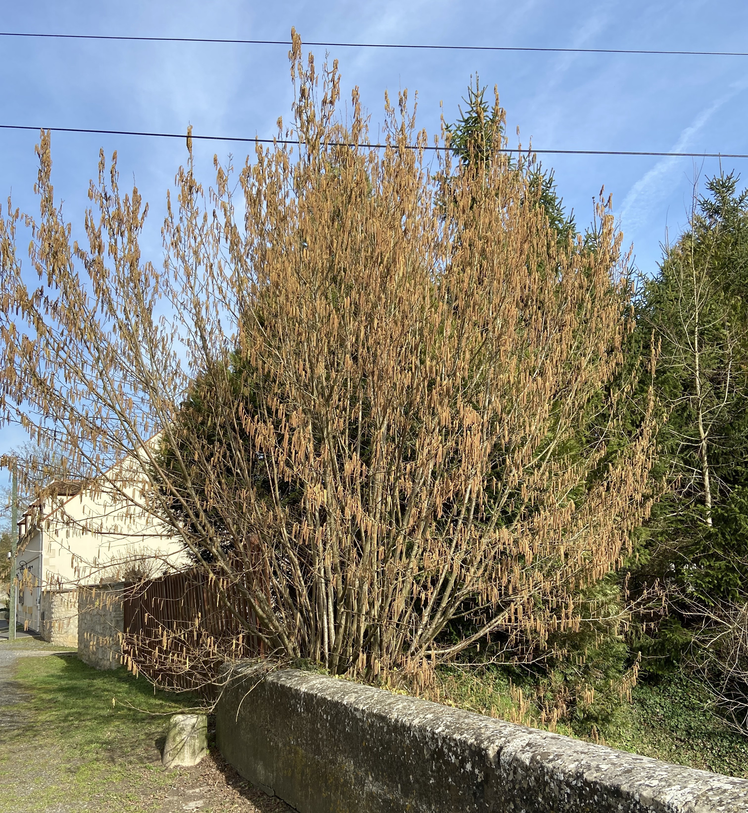 Le noisetier ou coudrier est un arbrisseau de la famille des Bétulacées, qui mesure 5 à 8 mètres de haut. Cet arbrisseau forme une touffe multi-gaule de 10 à 12 troncs fins. Les inflorescences mâles sont des chatons en forme d’épis d’une longueur de 5 à 10 centimètres. Ils fleurissent de la mi-décembre à mars.