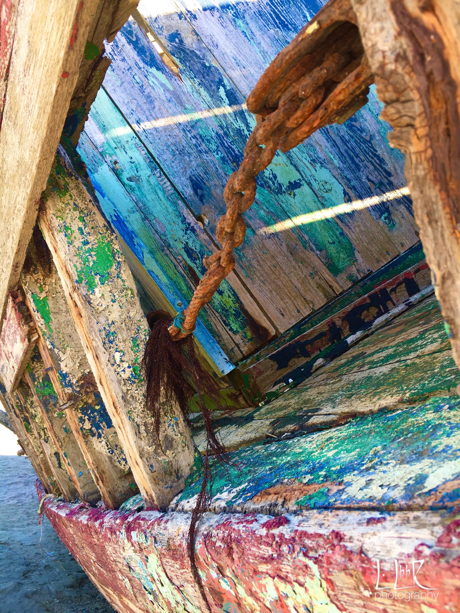 Détail de cette épave couchée sur le flanc dans le havre de Portbail.