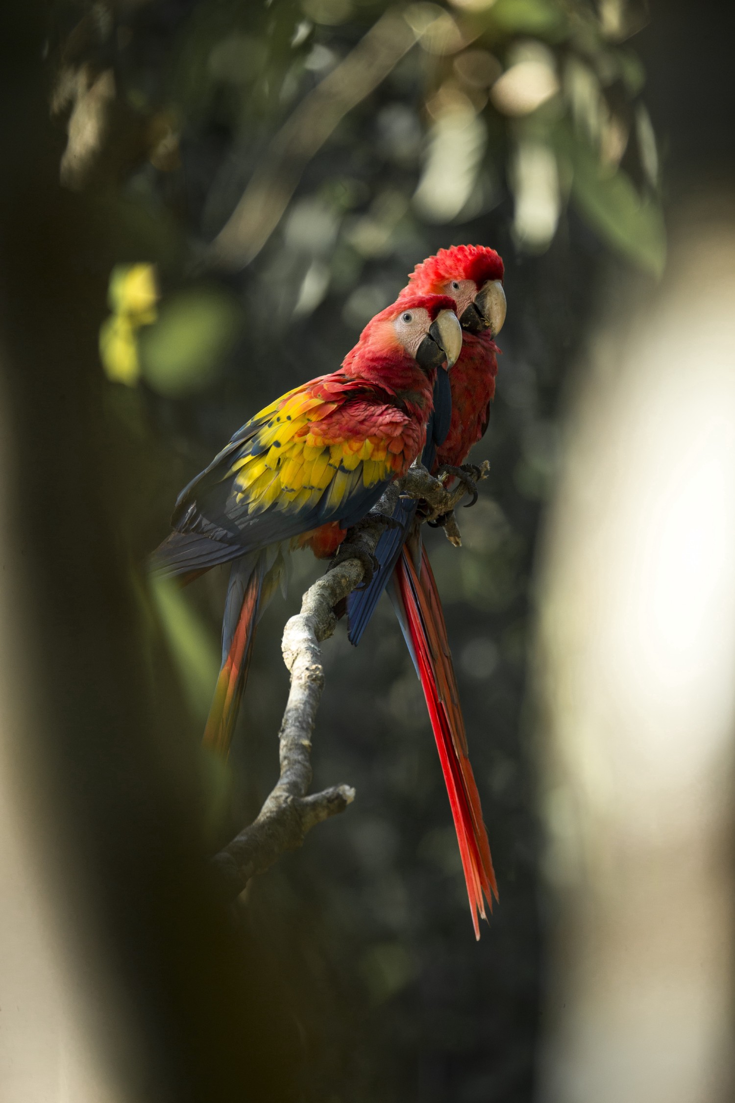 With its plumage with vibrant colors, the scarlet macaw (Ara macao) is a very charismatic bird. As lovebirds, this endemic species from Central and South America lives with the same partner all its life. The couple flies together through the canopy, their wings almost touching each other.