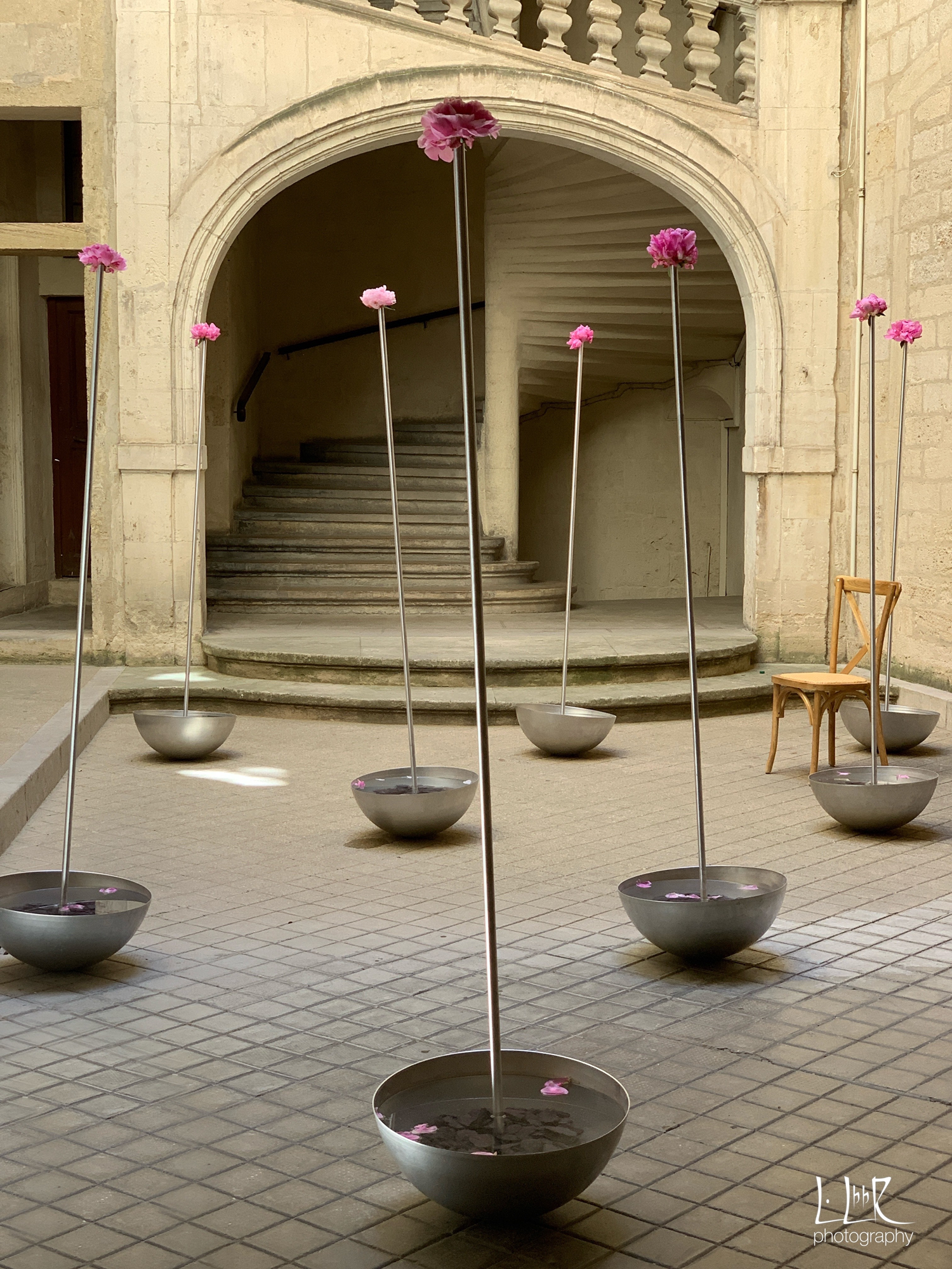 La proposition de Kuma et Elsa, le duo d'artistes, souhaite révéler la beauté du site grâce à son architecture. Leur projet consiste à installer un petit jardin où les fleurs sont rehaussées, légèrement au-dessus des yeux. Ce dispositif accentue la verticalité de la cour, en créant de nouveaux espaces.