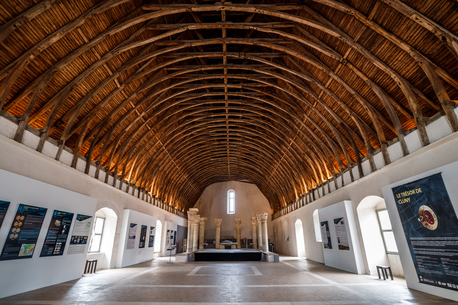 Some 177 ft (54 m) long, the first floor of the flour mill of Cluny Abbey has the particularity of being covered with an imposing oak frame in reverse hull for more lightness. It was built by carpenters from the Brest shipyards with beams cut and dried for 120 years then bent 50 years before being assembled. The frame is paneled with chestnut. Formerly used as a grain storage attic, the room now houses a lapidary museum where the renowned Romanesque capitals of the choir of Cluny III are exhibited.