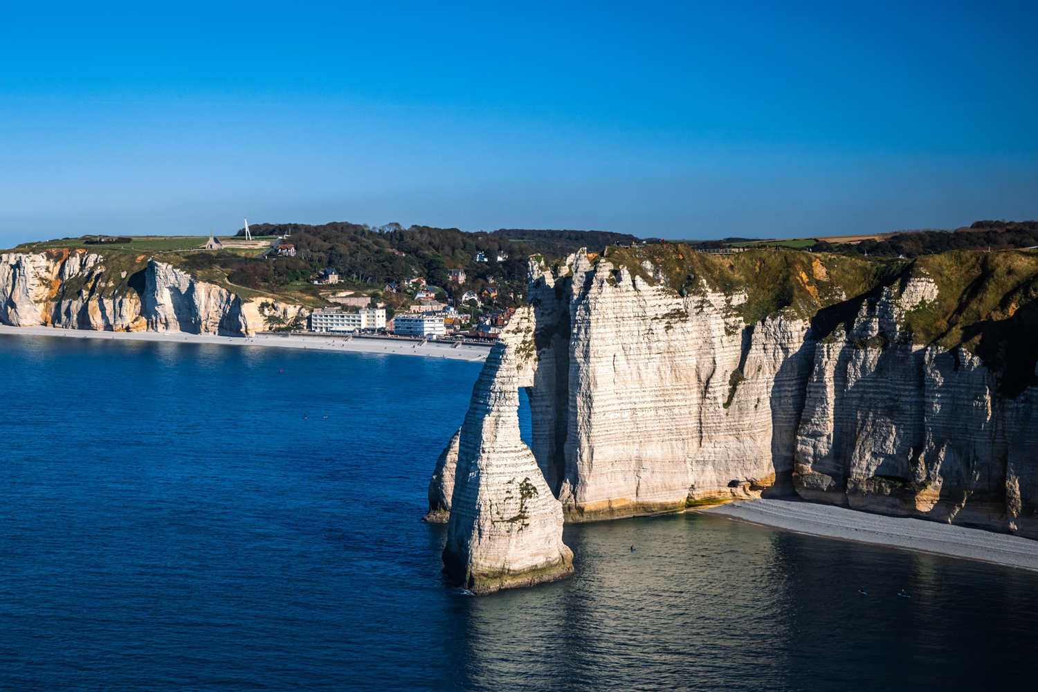 The composition of the cliffs of Étretat can be analyzed through the fallen blocks. Instead of chalk, some seem encased in biocalcarenite, an accumulation of marine fossils such as bryozoans, bivalves, and sea urchins. That would explain how the cliffs of Aval, Amont, and La Manneporte were pierced with arches. Subterranean rivers probably dug the rock by eroding the limestone. Even today, an underground river lets freshwater pass between the pebbles.