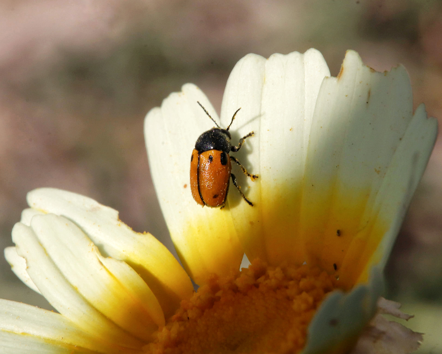 Color de base negro, excepto los élitros que son anaranjados; tiene 14 artejos en las antenas y estas son poco menos largas que el cuerpo; sobre los élitros presenta manchas negras no siempre en el mismo número, ya que hay variaciones, suele tener una mancha en el borde anterior del élitro en su zona más próxima al abdomen, otros presentan una mancha humeral, como la descrita anteriormente, otra en el borde anterodorsal, y otra al final del élitro, otra variedad muestra una banda negra que une los puntos negros anterior y posterior de cada élitro; pilosidad blanquecina y corta.