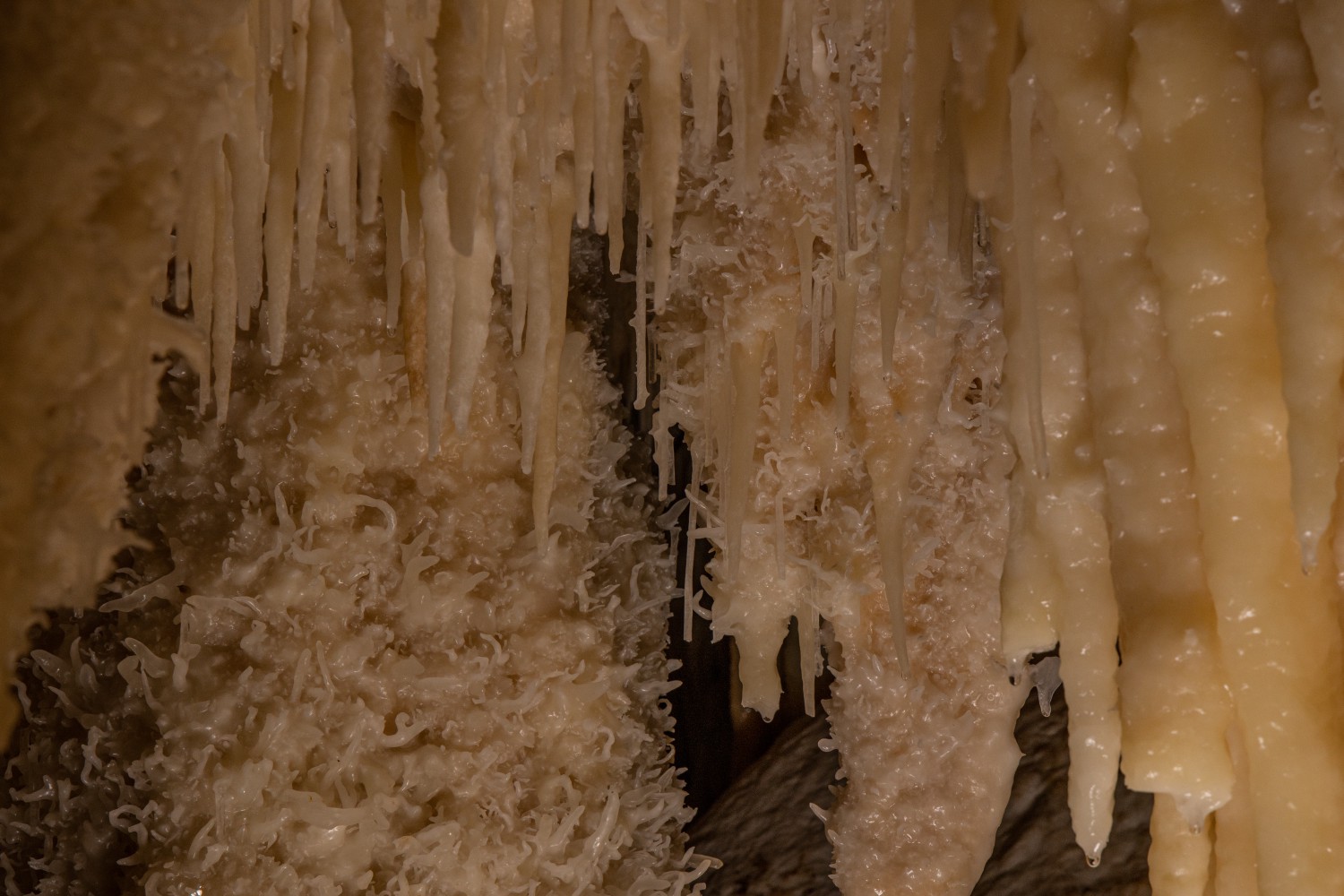 The stalactites in Qanono Cave, on Lifou Island, show a great variety of morphology. They are sometimes massive and form large columns with the stalagmites on the ground. They are found in the form of a coral branch (coralloids) or their fine needles twist to form twisted tufts (plumose aragonite). More generally, the stalactite forms straight points (fistular stalactites) whose starting section varies between 0,19 inch and 0,39 inch (0.5 cm and 1 cm). They are hollow and release the drops that will make them grow.
