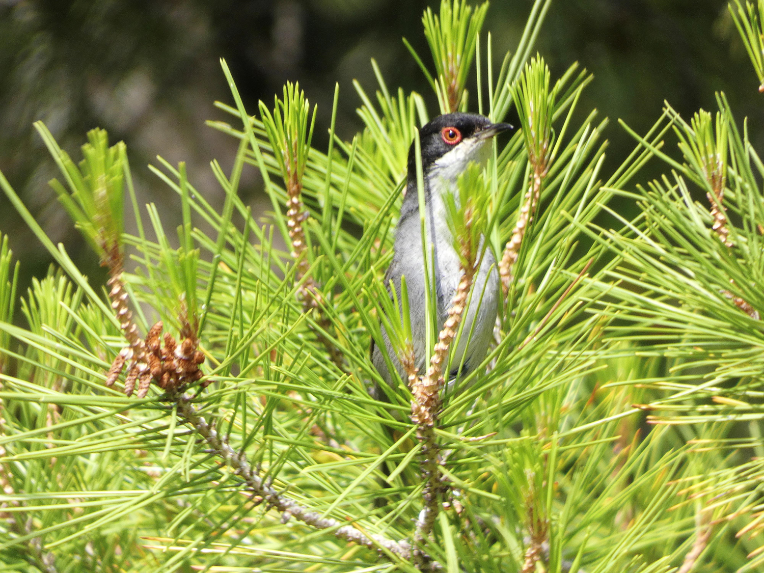 La curruca cabecinegra es una especie muy característica debido a su silueta larga y delgada, pero también a su tamaño y estructura. En conjunto es una curruca mediana, ligeramente más pequeña en el Próximo Oriente. Destaca por la cabeza distintivamente negra en el macho y gris en la hembra, pero los juveniles son fundamentalmente parduscos, si bien la cabeza es más grisácea. La garganta es blancuzca y muy destacada en todos los plumajes. Ostenta alas cortas y redondeadas y cola larga con diseño muy contrastado, de base negruzca y amplias banderolas externas blancas, con las puntas de las rectrices también blancas; este diseño también es similar en todos los plumajes. Patas pardo apagado. Iris pardo rojizo o pardo anaranjado en el adulto, o pardo gris oscuro, pardo oliváceo o pardo pálido en el primer invierno. Anillo orbital de rojo ladrillo brillante en el macho adulto, a pardo rojizo apagado en los otros plumajes.