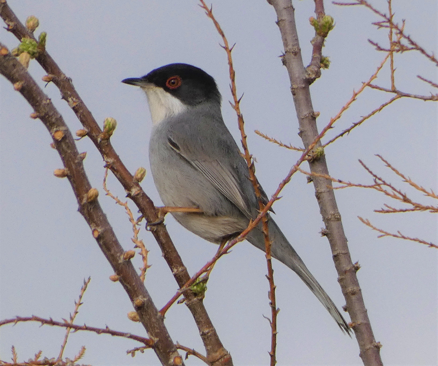 Los machos presentan la cabeza negra desde el pico y por debajo de los ojos que va en contraste con el color blanco de la garganta y parte inferior de los carrillos. El lomo es gris tirando a oscuro, de tal forma que la espalda y dorso de las alas pueden describirse con un tono gris pizarra o ceniza oscuro, con un ligerísimo tinte parduzco que podremos comprobar únicamente si sujetamos a esta curruca entre nuestras manos ya que es inapreciable cuando está posado o en vuelo. El pecho y el vientre son de color blanco. Los lados del pecho y los flancos son grises. La cola es muy oscura, prácticamente negra, con rayado gris y destacando mucho el blanco de la pareja exterior de rectrices. Las plumas primarias y secundarias de las alas son pardo negruzcas.