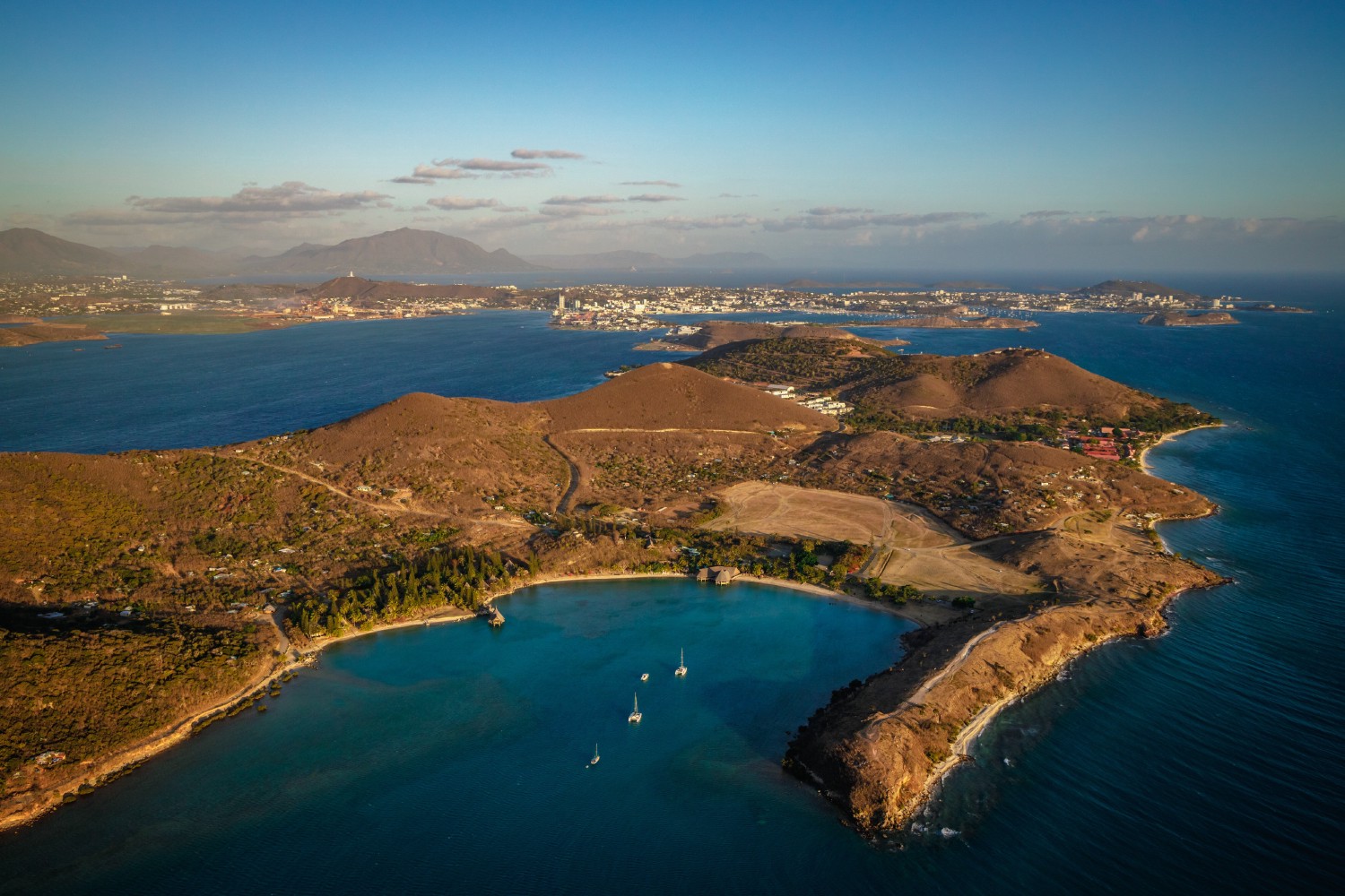 In the foreground of this aerial view of the Caledonian capital, appears the island of Nou, which has become the peninsula of Nouville. A landmark in the history of New Caledonia, it was exchanged with the English merchant James Paddon by France to establish a penal colony there in order to boost the settlement of colonists. Between 1864 and 1931, 75 boats supplied this new territory with men. In 1972, a dike was built to link the island to Grande-Terre by transforming it into an artificial peninsula.