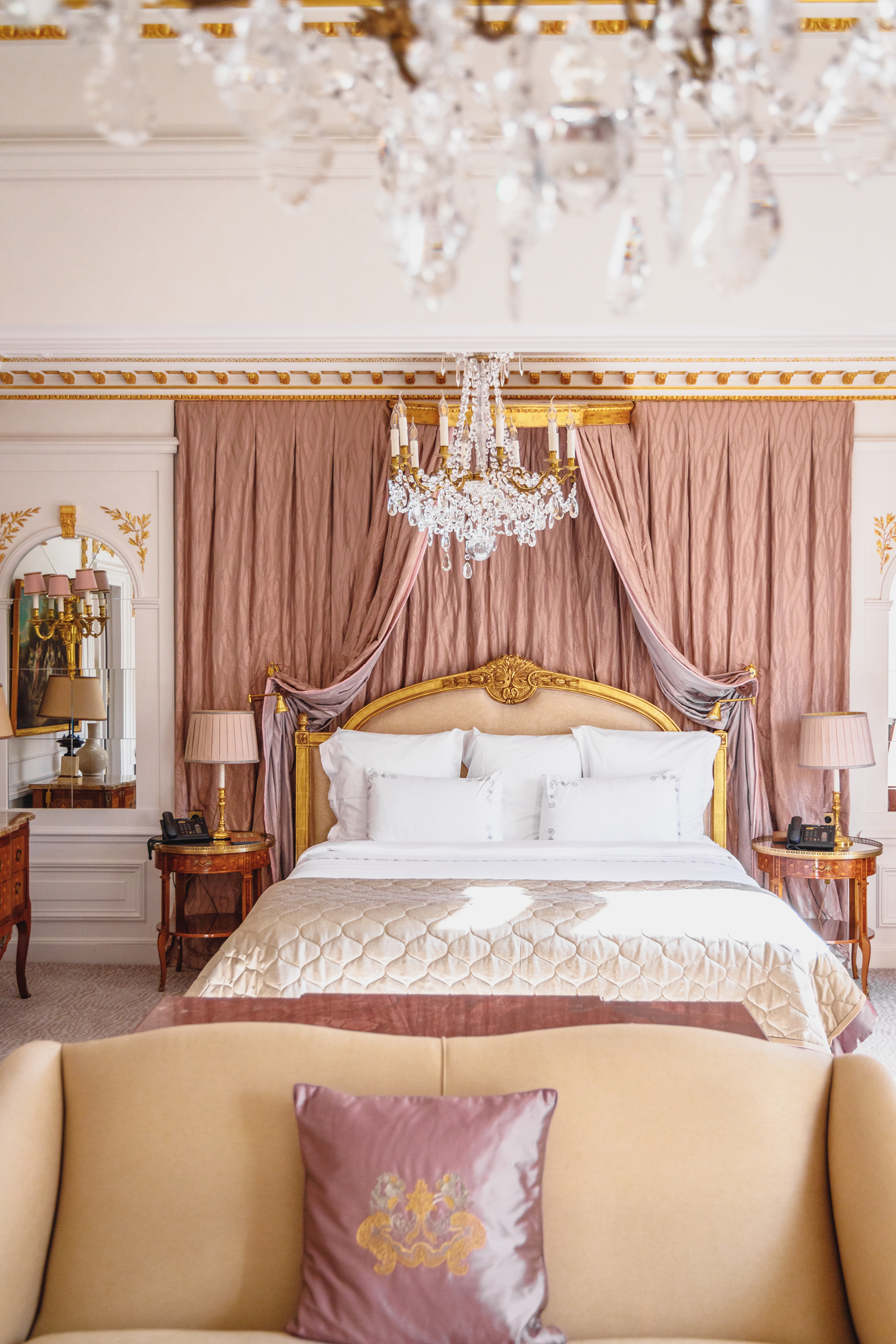 The Royal Suite at the Plaza Athénée Hotel is the largest hotel suite in Paris. Its four rooms and two lounges are decorated with authentic 18th-century furniture and collectors’ items. The decorator Marie-José Pommereau has given it a “royal” style that is both classic and Parisian. With four bathrooms, an office and a separate kitchen, the suite occupies the entire fifth floor of the hotel and has a breathtaking view of the Eiffel Tower.