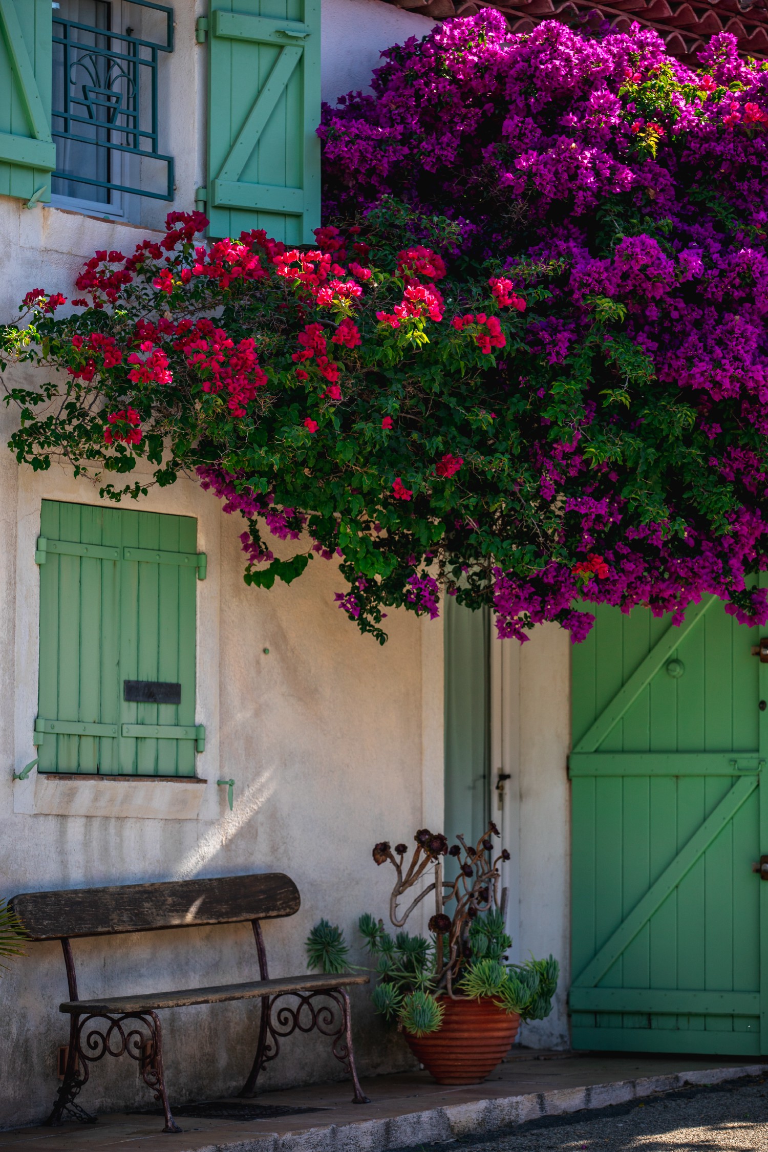 Bougainvillea are thorny and particularly colorful climbing shrubs highly valued as ornamental plants. Commonly mistaken for petals of brightly colored flowers, the bracts at the end of the branches are not the flowers of the plant. They owe their pronounced color to the presence of betacyanins combined with large amounts of flavonols. The flowers are, for their part, small and white and concealed by the bracts.