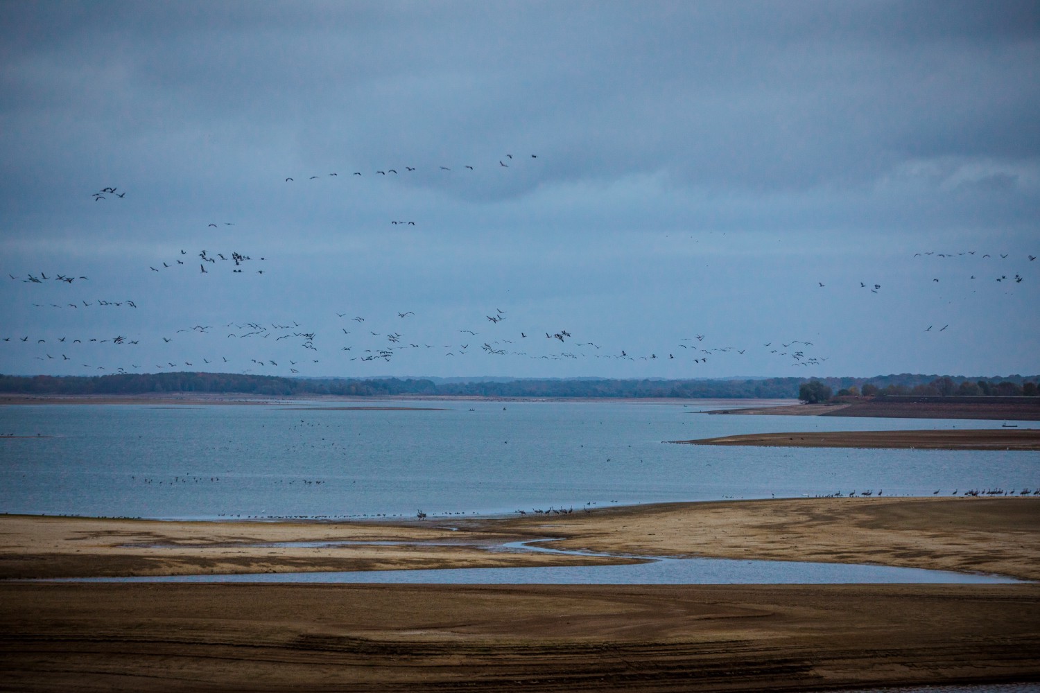 The Lac du Der-Chantecoq in the Champagne region of France has become one of the main sites for the resting of Common Cranes (Grus grus) in Western Europe. As a proof, the year 2019 has beaten the world record for the concentration of Common Cranes, which dated back to 2014: 268,120 individuals were counted on the Lac du Der on 3 November. Some do not continue their migration and choose to winter around the lake. As soon as the sun begins to decline, the cranes that have left to feed in the vicinity return to the lake for the night, in noisy groups, in a very orderly V formation.