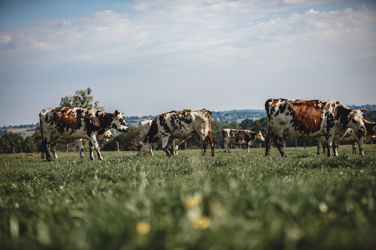 The Naturellement Normande farm has opted for Norman cows renowned for their docility and the protein quality of their milk. Its 55 dairy cows graze on 197 acres (80 ha) from spring until the beginning of winter. In winter, they are kept warm in a heated building and keep eating the dry, organic hay that Denis Lelouvier has harvested on his land.