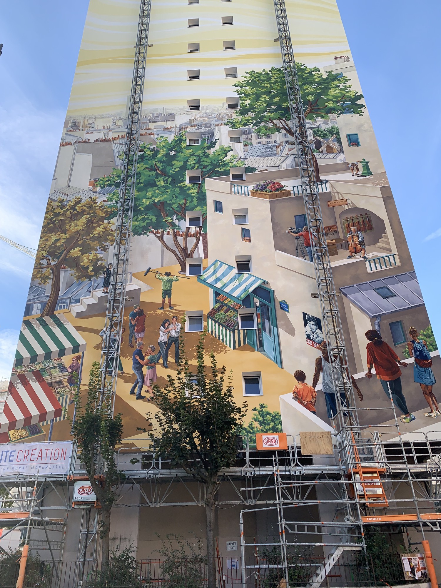Gros plan du mur peint en cous de réalisation. Des personnages apparaissent, des étals de boutiques s’installent, la place est nommée (Place des Fêtes) et elle est symbolisée par des danseurs et un hommage à Edith Piaf, enfant du quartier qui, à sa naissance, vivait 72 rue de Belleville.