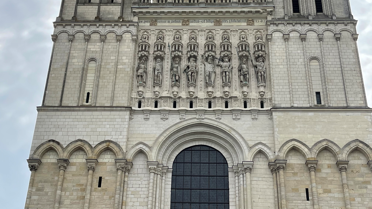 Cathédrale Saint-Maurice d’Angers ( Maine et Loire ) . Au second niveau de la façade, on ajoute en 1537 huit statues : saint Maurice et sept soldats de la Légion thébaine, compagnons de son martyre. Les statues de la façade datent de 1537. On y a placé des copies en 1909.