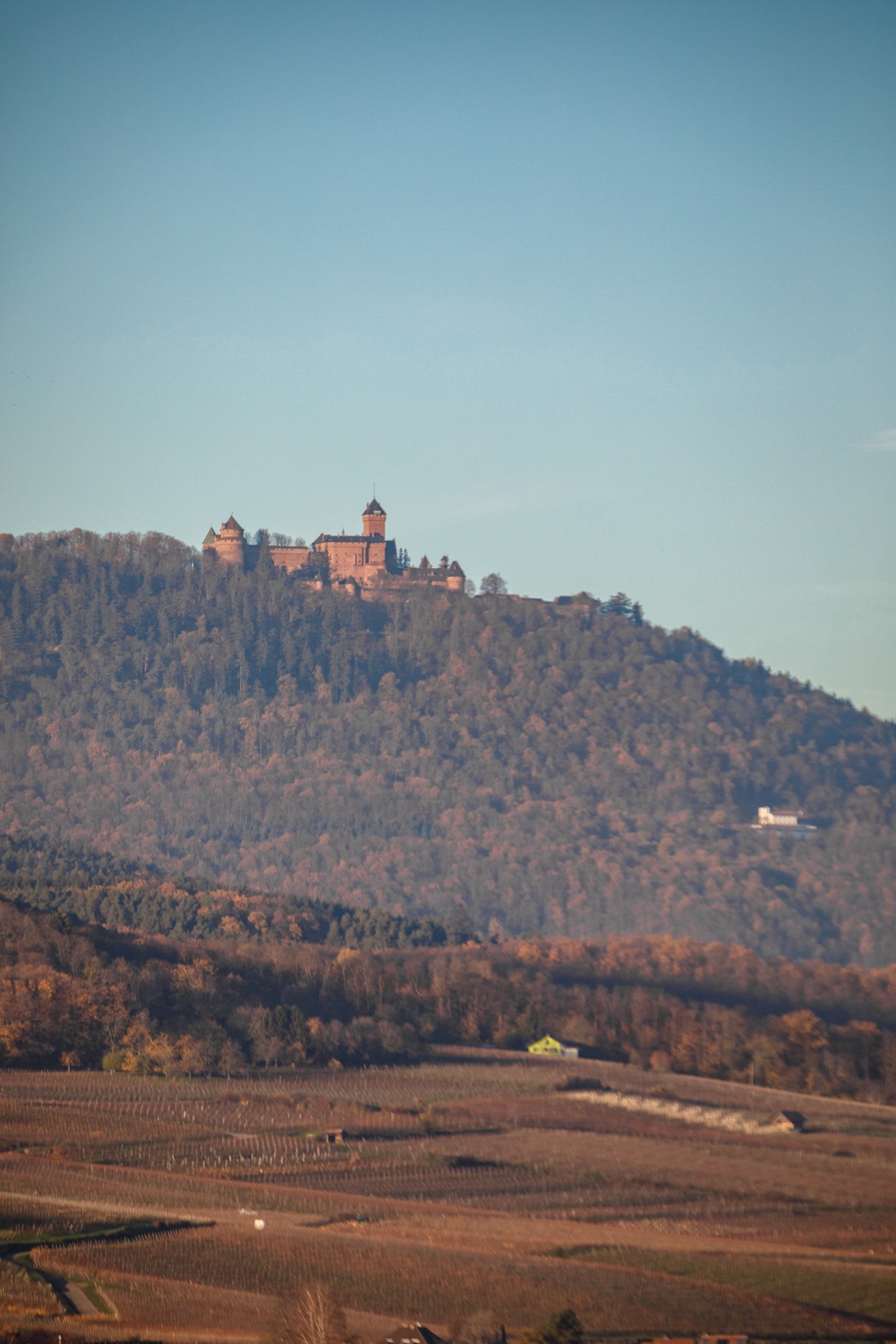 The castle of Haut-Koenigsbourg looms among the fir trees on a rocky outcrop standing over 2,480 ft (750 m). Its donjon surmounted by the imperial eagle of Kaiser Wilhelm II affirms its dominance. Since the Middle Ages, it has watched over the large plain of Alsace that stretches out at its feet. It was the object of numerous covetousness and excuse for a war between the Bishop of Strasbourg and the Duke of Lorraine. Destroyed in 1633 during the Thirty Years' War, it remained unoccupied for more than two centuries. The medieval nostalgia of Wilhelm II brought it back to life in 1908.