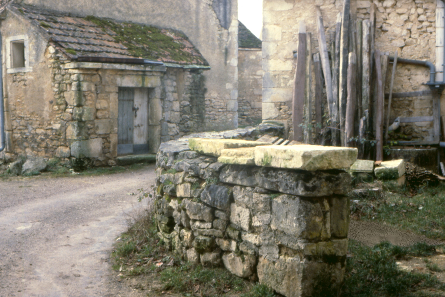 Antique remains in the medieval village of Druyes les Belles Fontaines, Burgundy, dating from the 6th century: limestone and dry stone walls