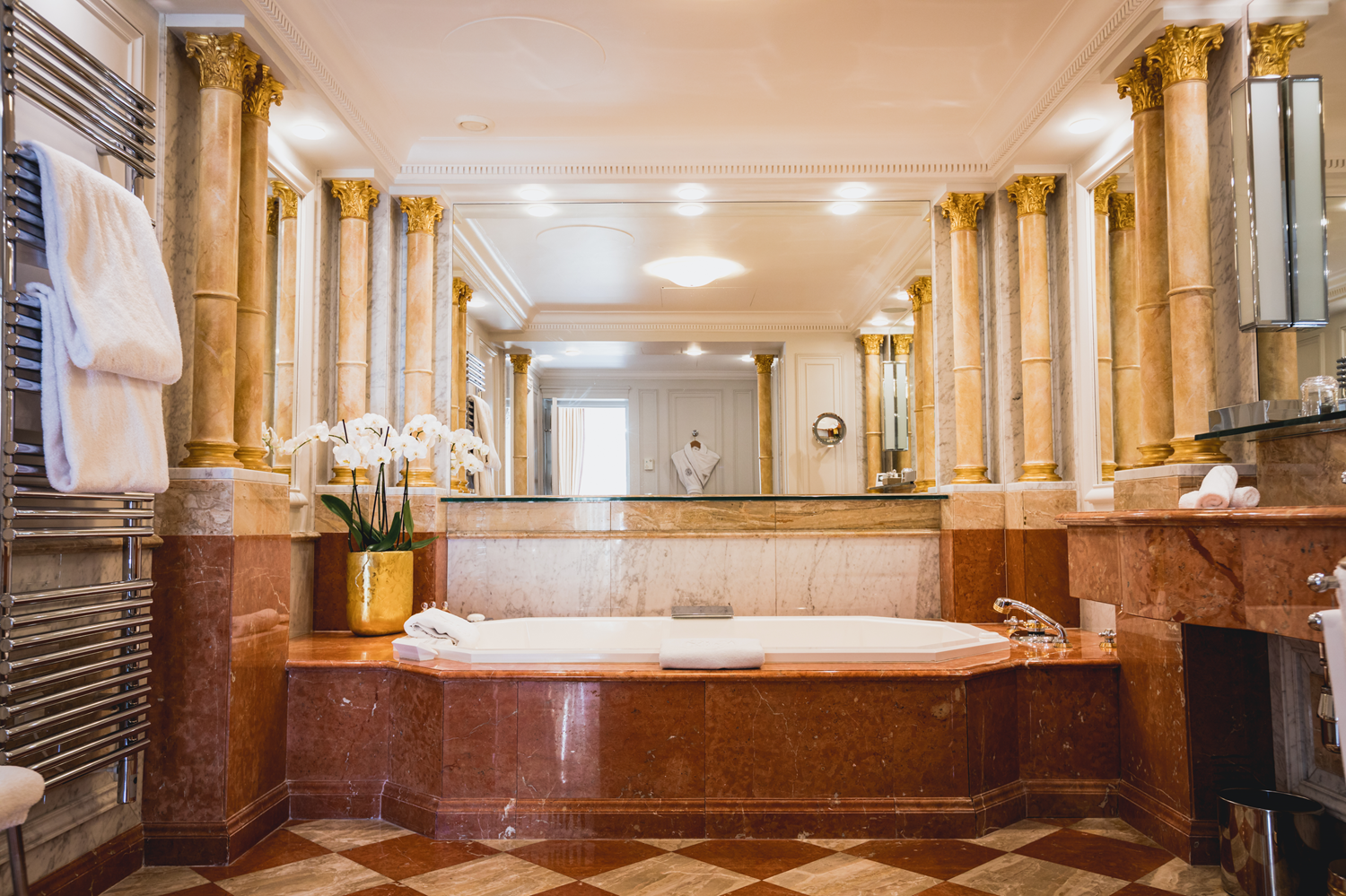 With a surface area of 4,844 sq. ft (450 m²), the Royal Suite of the Plaza Athénée Hotel is the largest in the hotel and the largest suite in Paris. Designed as a prestigious flat, the suite has two living rooms, a dining room, a kitchen and four bedrooms with en-suite bathrooms in red porphyry (Lapis porphyrites or purple stone). In ancient times, porphyry was the stone of choice for the Egyptian pharaohs and the Romans. The beige marble of the columns, with their golden capitals, matches the floor and is reflected in the large mirrors on the wall.