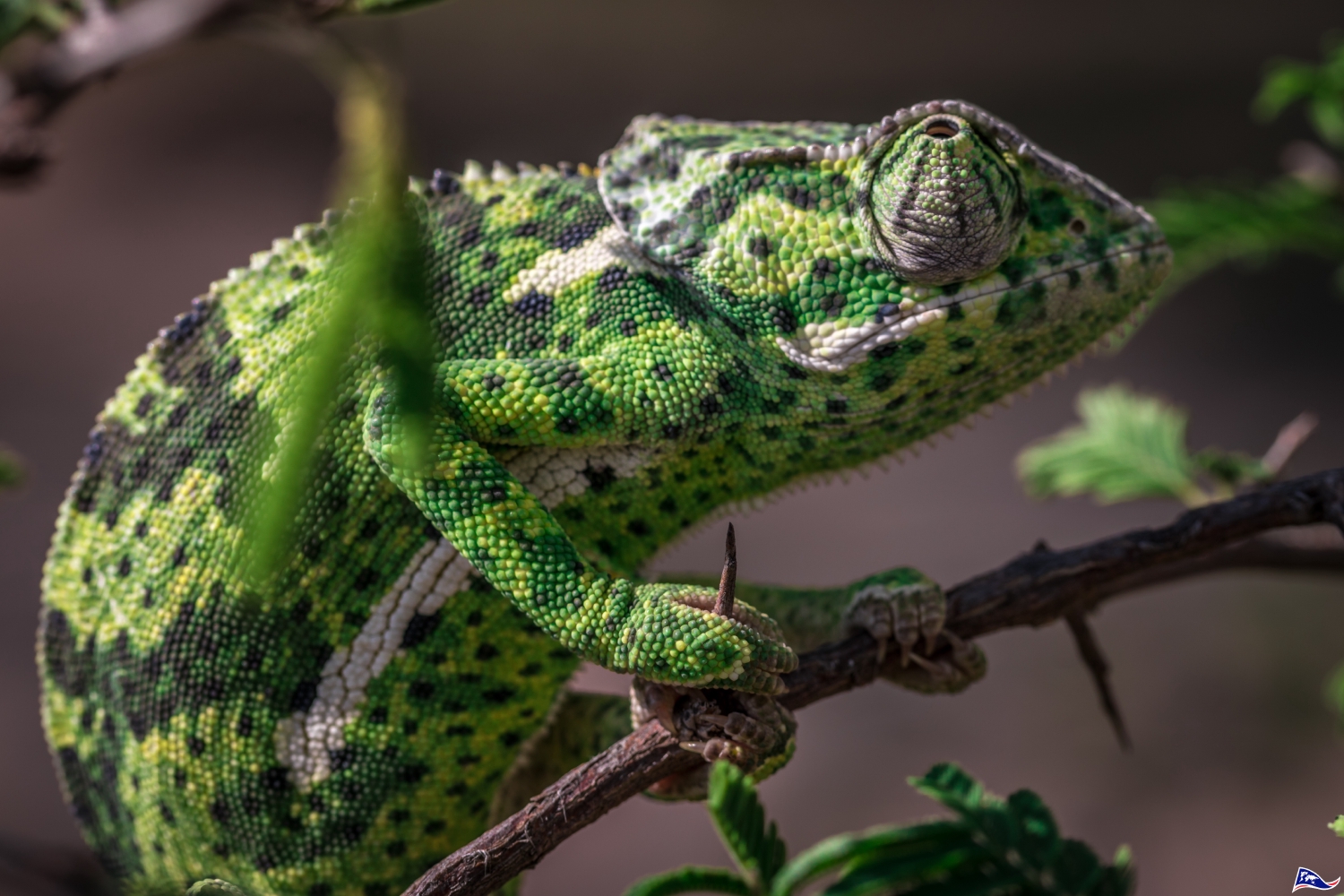The flap-necked chameleon spend most of its time in the shrubs and in the bushes. Despite its ability to change color to blend into the environment, it might be preyed on by spiders, snakes, such as boomslang, but also monkeys, or even birds, such as ground hornbills or raptors.