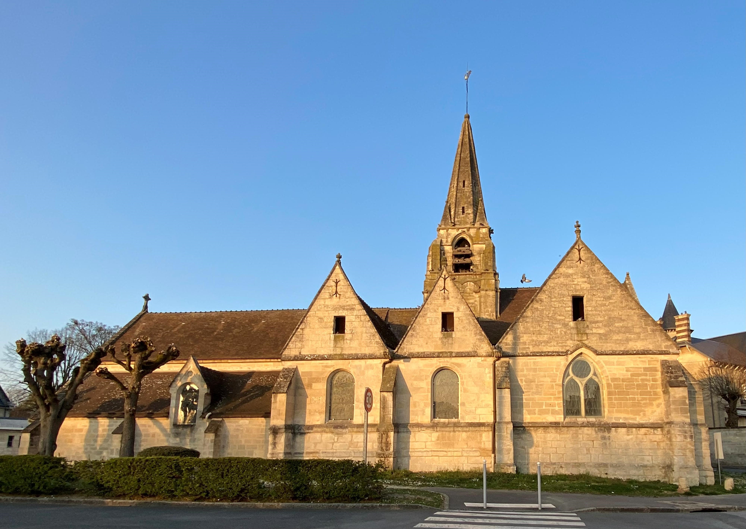Cette vue permet d’observer les trois pignons du collatéral du 15ème siècle ainsi que les toits des chapelles.