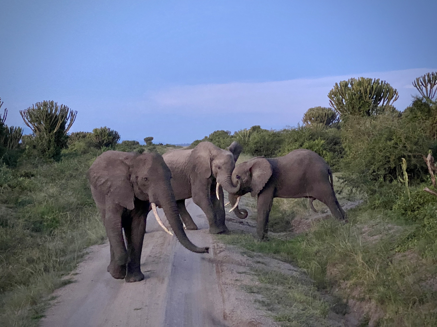 Two African bush elephants push back and forth at a road crossing while the matriarch looks on. She’s monitoring the pair behind her even as she keeps a watchful eye on the strangers in the truck.