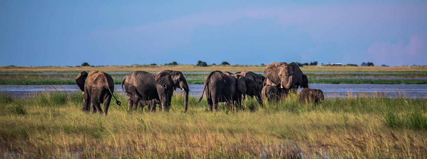 Led by the matriarch, this herd of elephants just took a bath in the Chobe river. A unique spectacle where many behaviors may be observed.