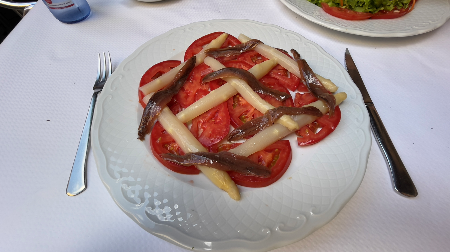 Santillana del Mar ( Cantabria - España 🇪🇸 ) . Echa con con filetes de anchoas, espárragos y lonjas de tomates . Una ensalada es una Hortaliza o conjunto de hortalizas mezcladas, cortadas en trozos y aderezadas con sal, aceite, vinagre y otros ingredientes.
