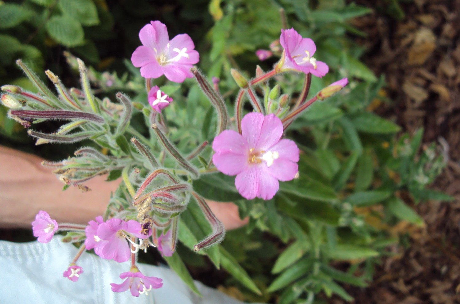 Les fleurs de 2 cm de diamètre ont 4 pétales échancrés rose vif ou rose pourpre, sont solitaires sur un long pédoncule