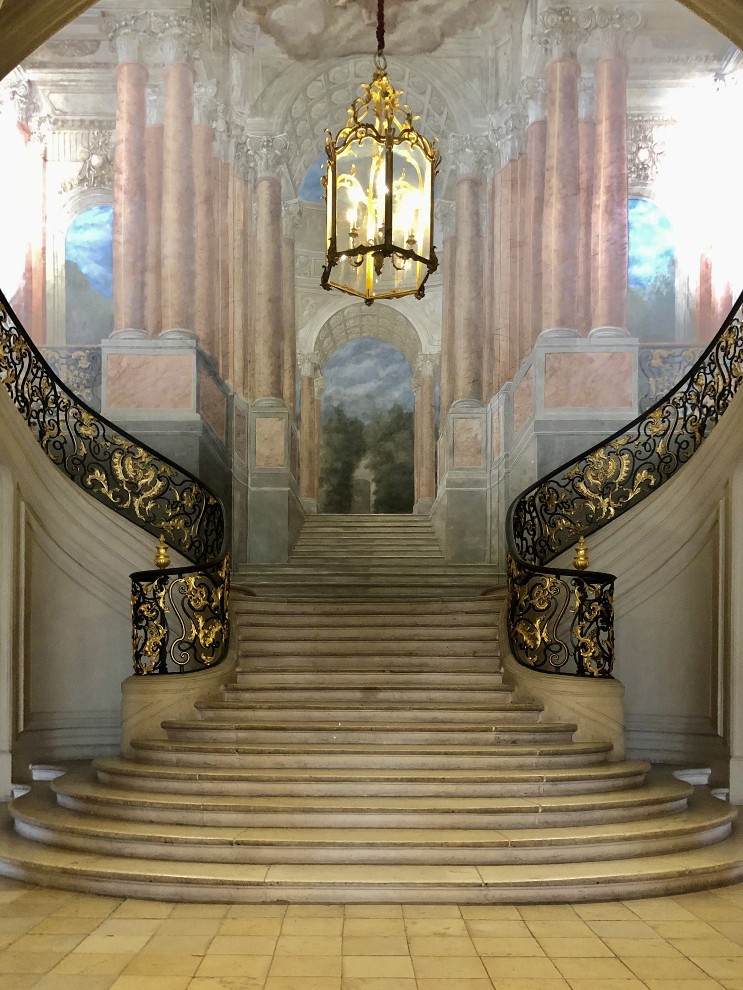 Ce superbe escalier est situé au bout d’un péristyle donnant sur la porte d’entrée de la Mairie.