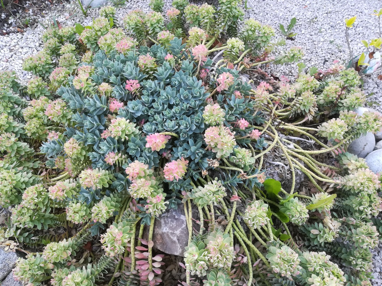 attire l’œil avec son feuillage charnu et bleuté disposé en écailles autour des tiges et sa floraison printanière jaune. Résistante au froid, au vent et au sec, elle ne demande aucun entretien pour prospérer !