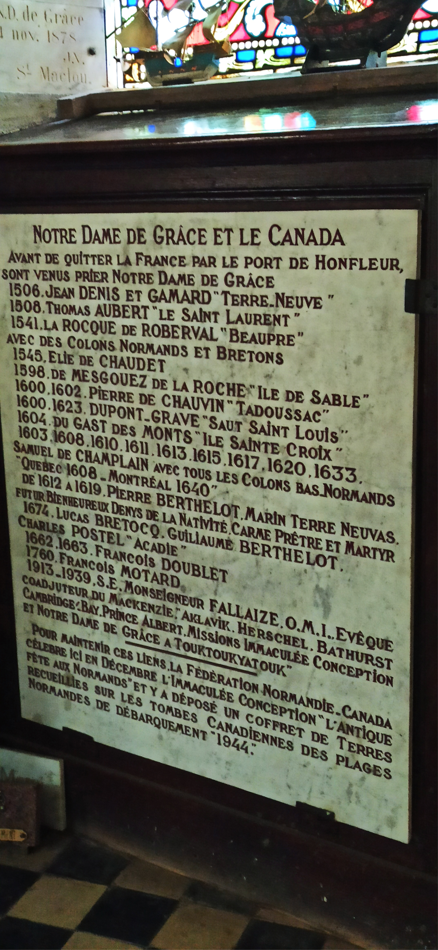 Des ex-votos sous forme de plaques de marbre et de tableaux perpétuent le souvenir de personnages célèbres venus se recueillir dans cette chapelle : Samuel de Champlain, Pierre Berthelot, Louis XIII, Bonaparte, Sainte Thérèse de Lisieux….
