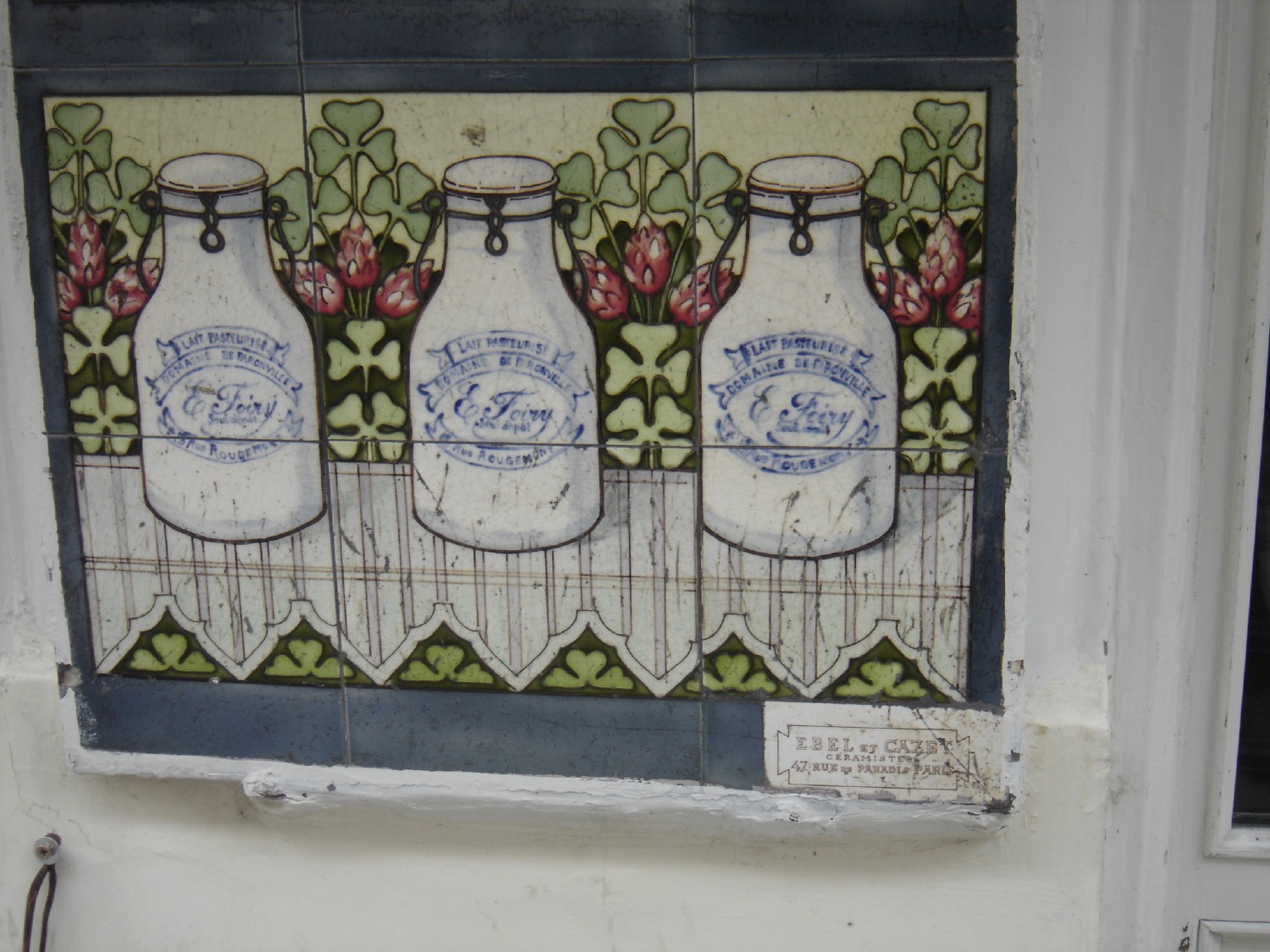 Faïence représentant des bouteilles de lait sur la façade de l'ancienne crèmerie-épicerie