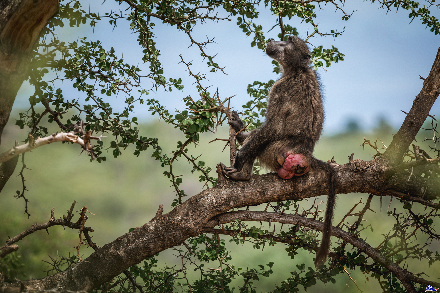 This female Chacma baboon is ready to mate. During this period, the genital and anal regions of the females inflate and progressively change color, from pink to bright red. As baboons are able to see in color, these variations inform males about females' predispositions to mate.