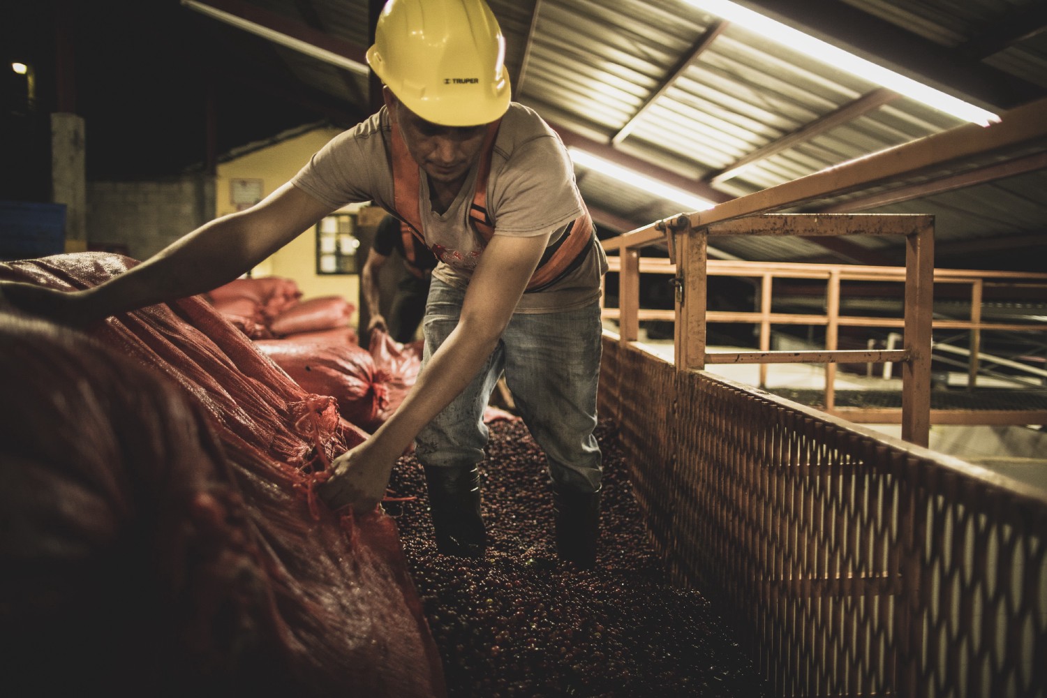 Après la récolte, les sacs de cerises de café sont apportées à la coopérative pour être traitées. Elles sont d'abord passées à travers une grille pour filtrer les branches et les feuilles, avant de subir un processus complexe de dépulpage, de lavage et de séchage qui permettra d'en extraire les fèves.