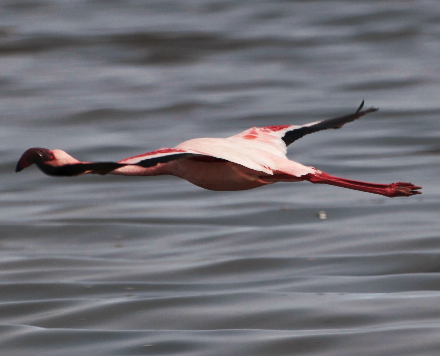 Flamenco enano o chico africano, en vuelo (Phoenicopterus minor)