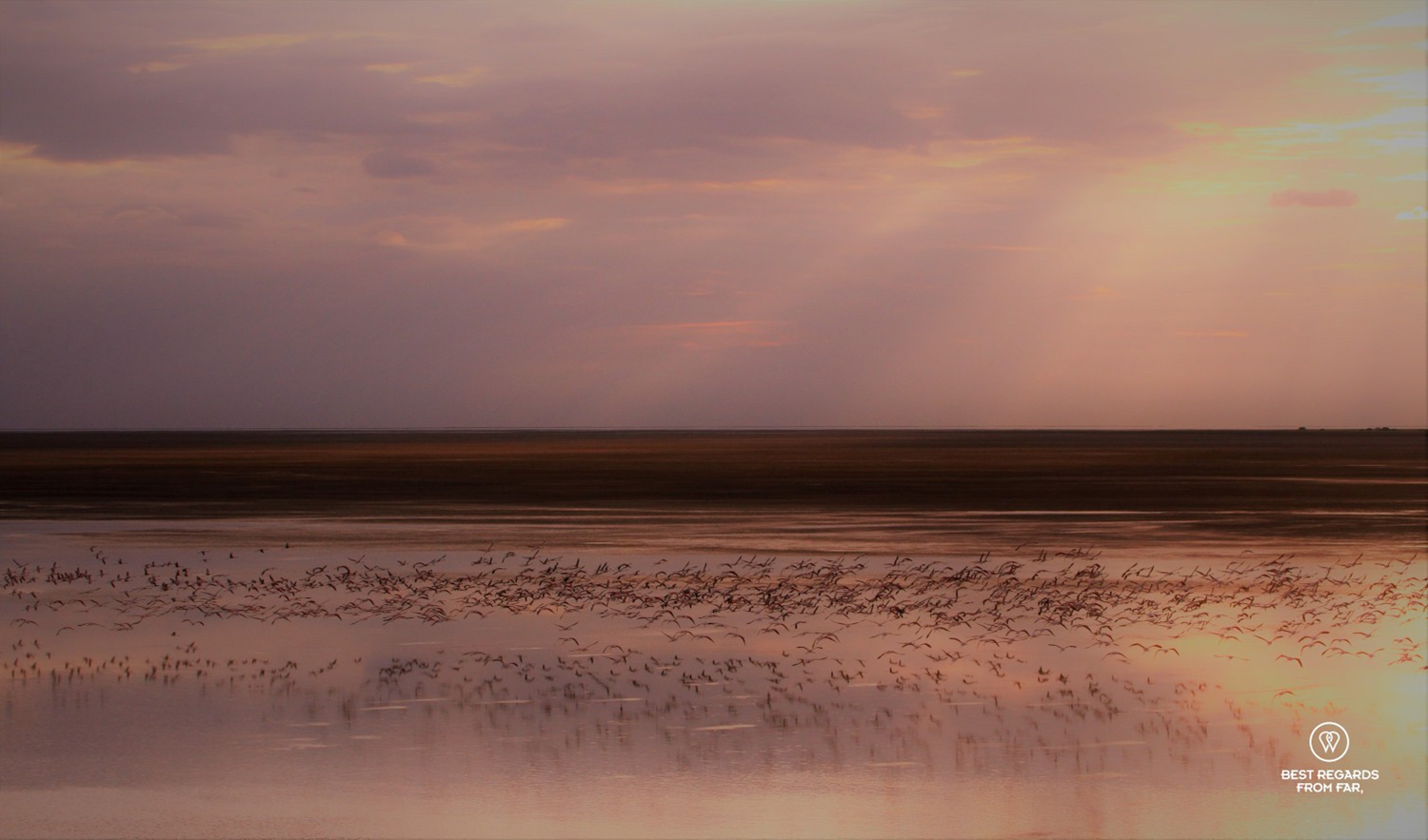 These flamingos took off at sunset causing a wonderful reflection in the lake and the tainted evening sky.