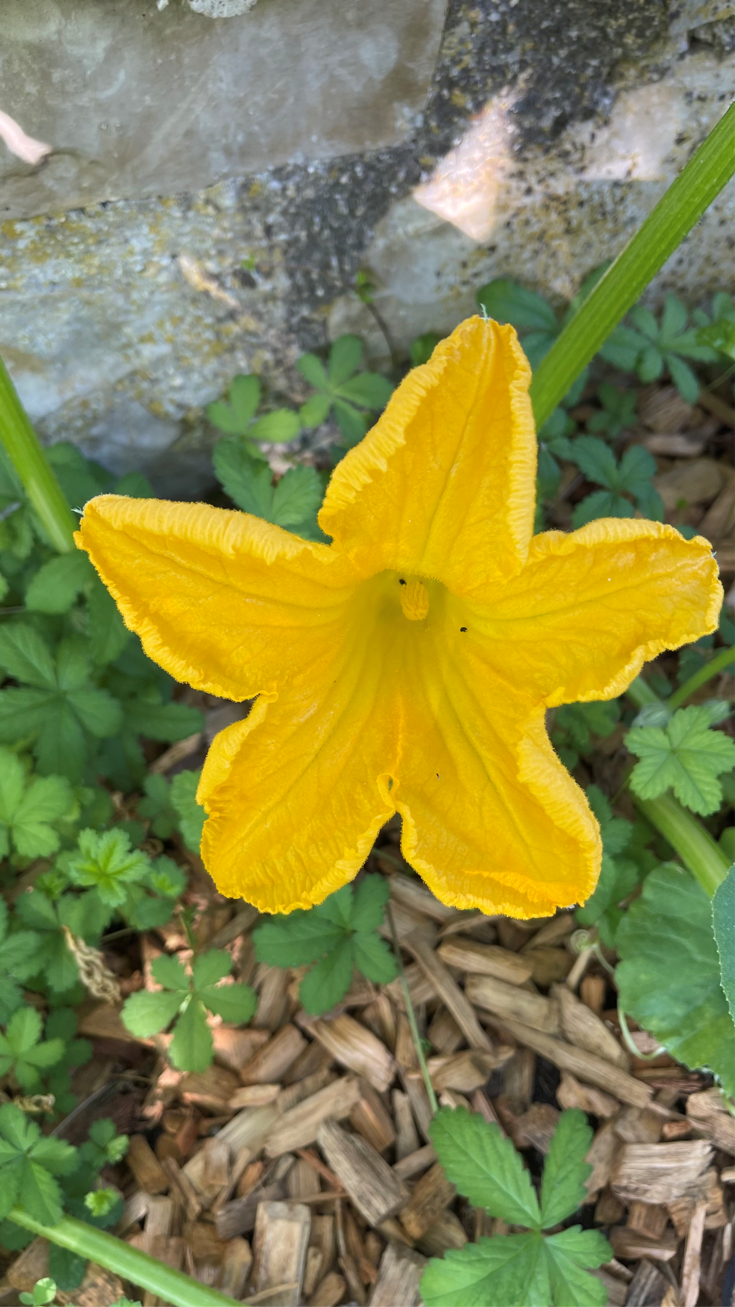 Senlis ( Oise ) . Cucurbita maxima est une grande plante. Ses tiges rampent ou grimpent sur parfois une dizaine de mètres. Ses grandes feuilles palmées, alternes et vert sombre, sont portées au bout d’un long pétiole dressé. Les fleurs, monoïques, sont soit mâles ou femelles, mais portées sur le même pied. La fleur femelle est reconnaissable tout de suite à la petite boule jaune, un mini potiron, que l’on voit sous le calice. Les fleurs campanulées sont grandes et jaunes, elles naissent à l’aisselle des feuilles. Les plantes ont tendance à produire d’abord des fleurs mâles en grand nombre, puis quelques fleurs femelles par ramification.
